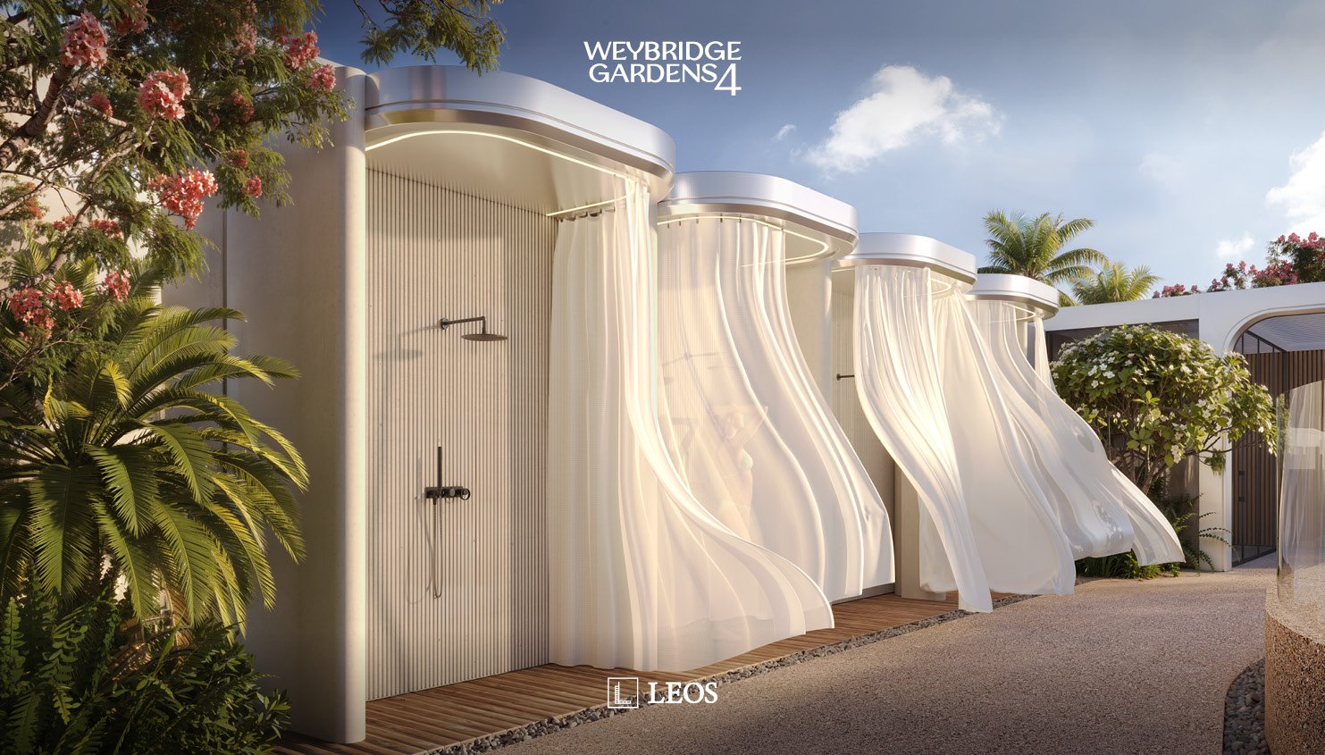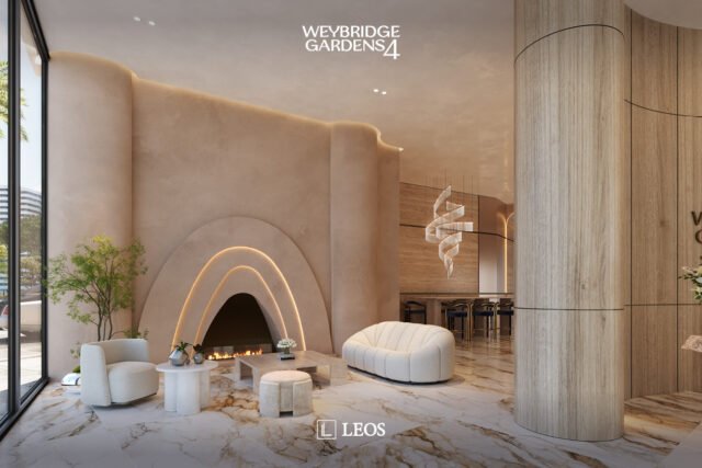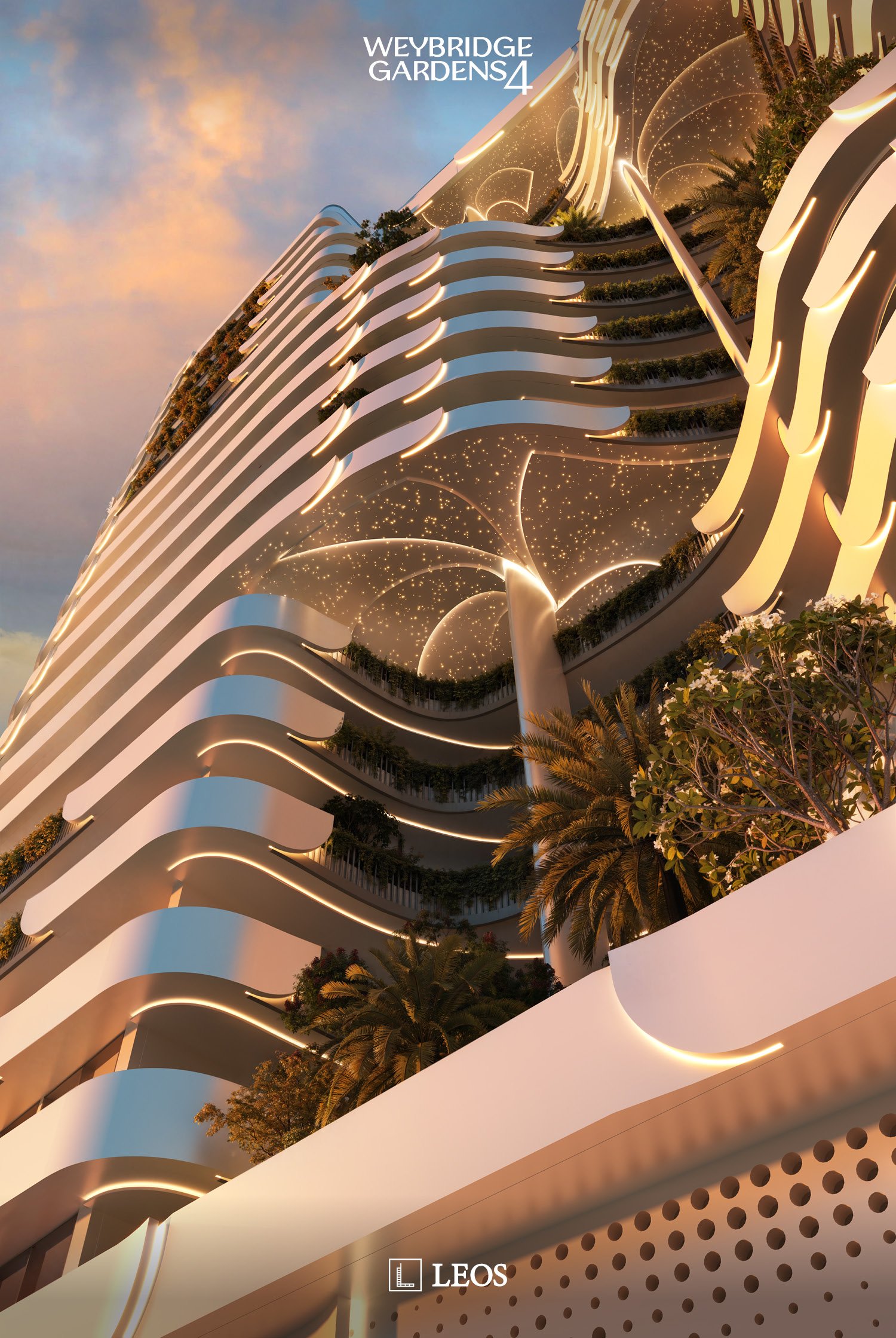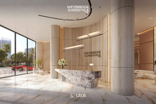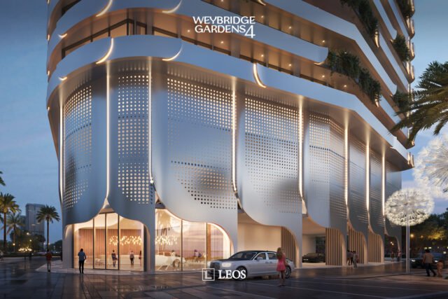 Inspired by nature, Weybridge Gardens 4 embodies the theme of blooming with organic, petal-inspired architecture. Its geometric facade reflects biological forms, while integrated lighting along the petal edges enhances its elegance, seamlessly blending exterior and interior. The Building’s columnar structures and curved balconies symbolize growth and vitality, seamlessly blending with greenery to reflect nature’s harmony. The rooftop, “Rebirth,” raws inspiration from water and wood, offering a serene oasis with wellness amenities and breathtaking urban beach views.