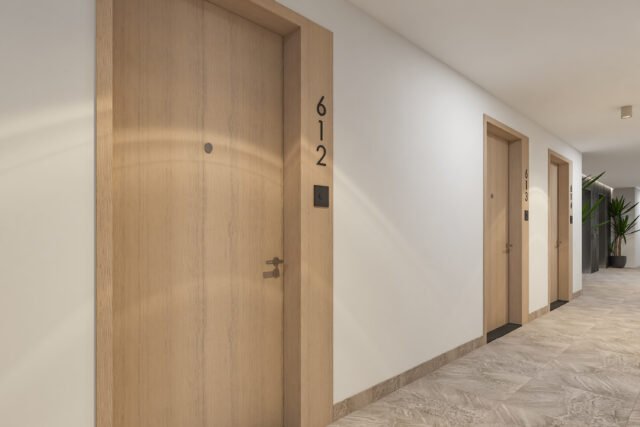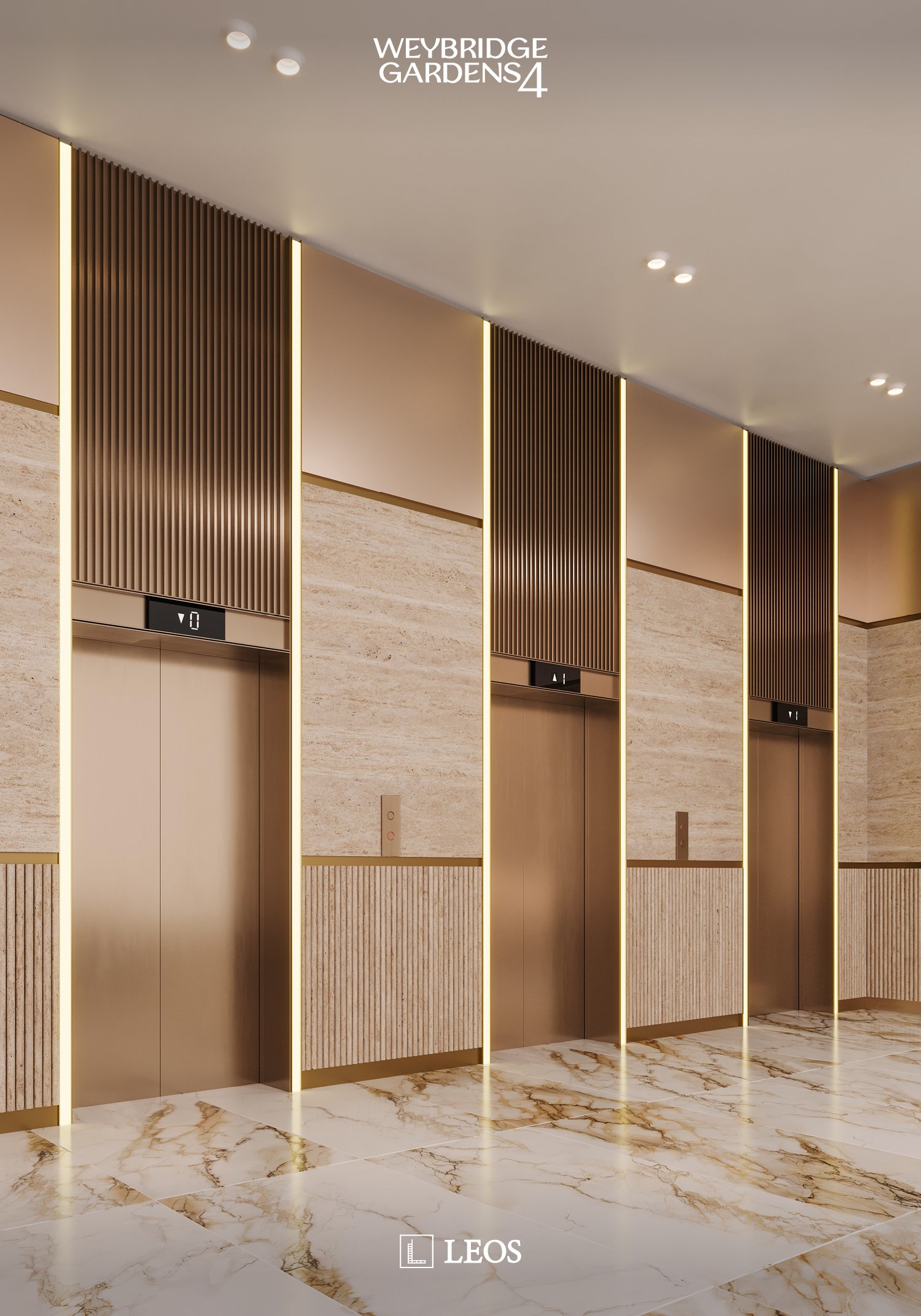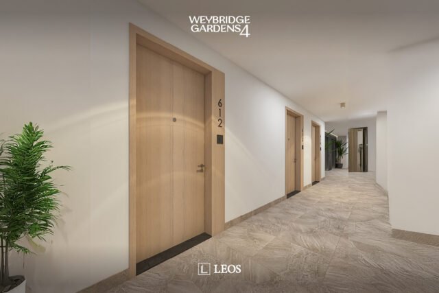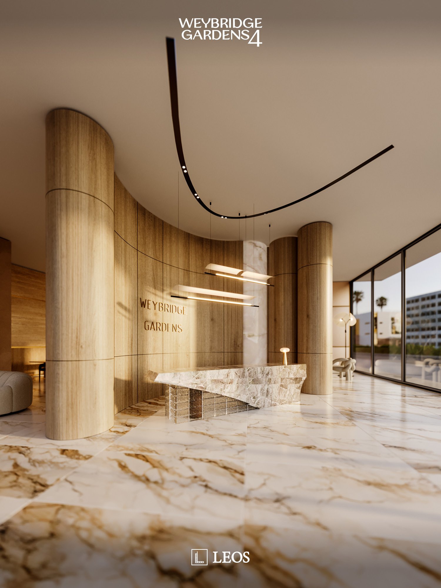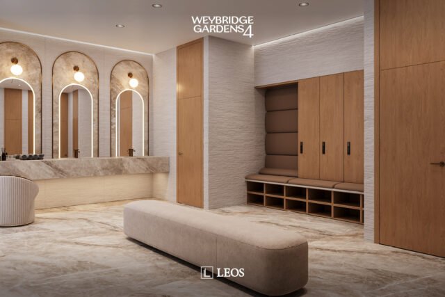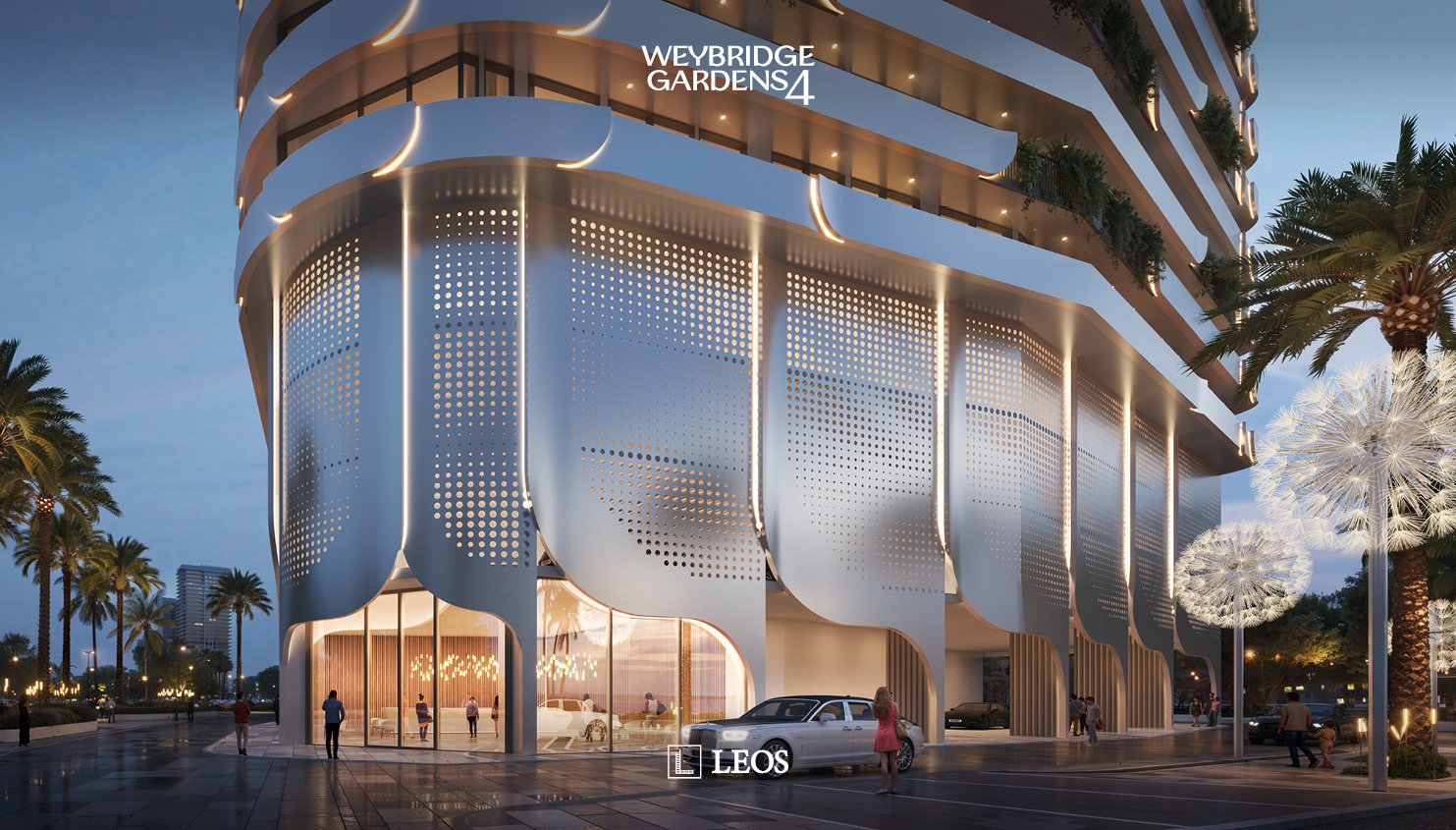 Inspired by nature, Weybridge Gardens 4 embodies the theme of blooming with organic, petal-inspired architecture. Its geometric facade reflects biological forms, while integrated lighting along the petal edges enhances its elegance, seamlessly blending exterior and interior. The Building’s columnar structures and curved balconies symbolize growth and vitality, seamlessly blending with greenery to reflect nature’s harmony. The rooftop, “Rebirth,” raws inspiration from water and wood, offering a serene oasis with wellness amenities and breathtaking urban beach views.